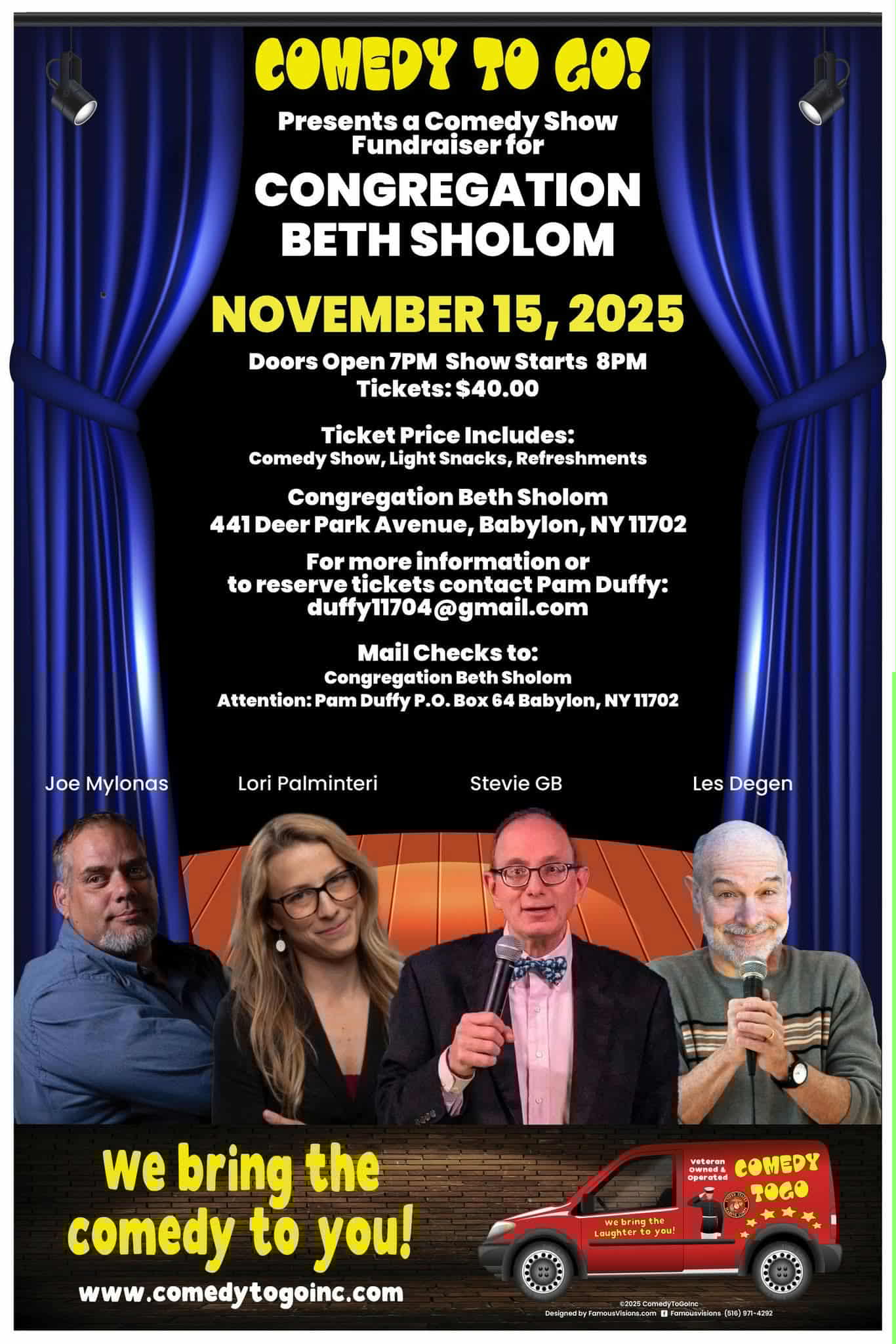 Congregation Beth Sholom, Babylon + Add to Google Calendar + iCal / Outlook export The event is finished. Date Nov 15 2025 Expired! Time 7:00 pm - 10:00 pm Share this event Contact Email lesdegen@gmail.com Phone 516-592-7823